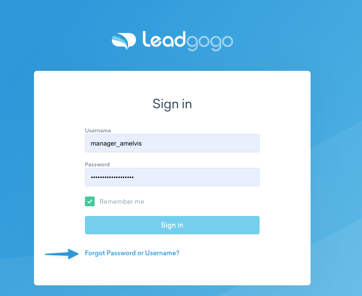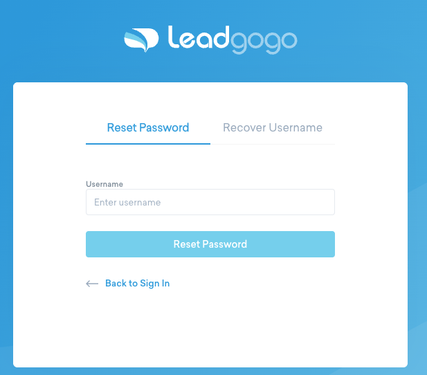 - Desde la pantalla de Sign in de Leadgogo, haz clic en la opción Forgot Password or Username?.