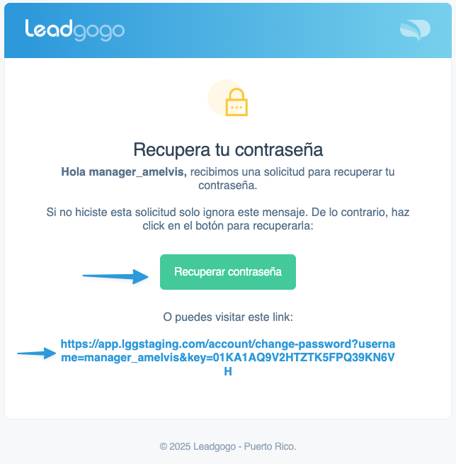 - Abre tu bandeja de entrada y busca un correo de Leadgogo con el asunto “Recupera tu contraseña”.Si no lo encuentras, revisa tu carpeta de spam o correo no deseado.
