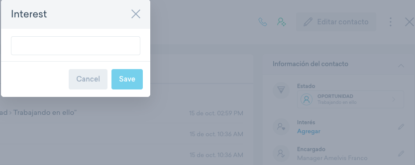 También puedes agregar o editar el dato Interés al crear o modificar un contacto, siguiendo los pasos que se explican en los artículos de la knowledge base: Cómo agregar un contacto y Cómo editar un contacto.