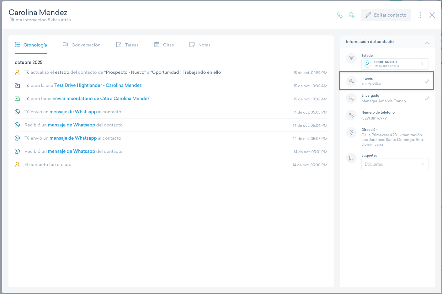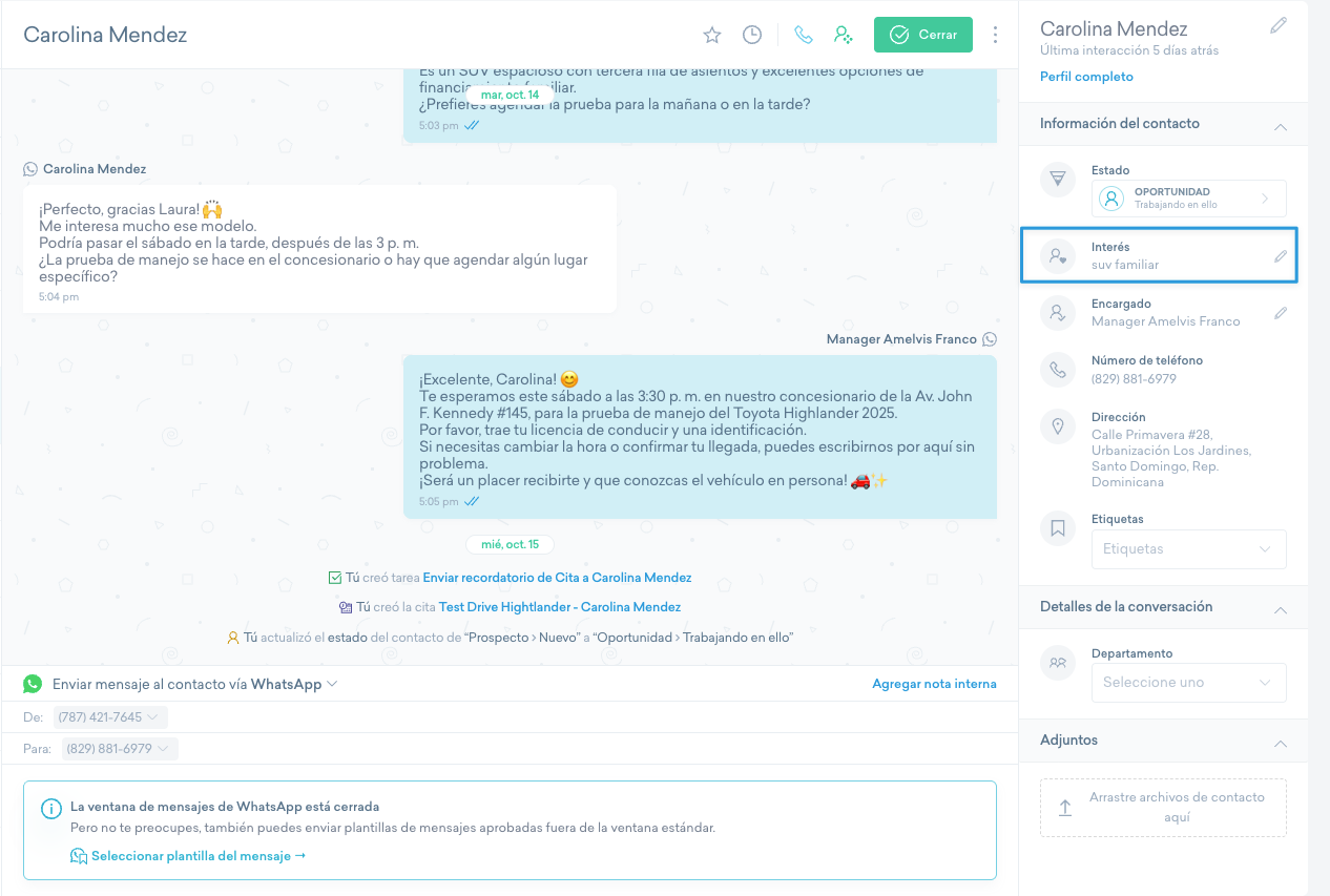 El interés indica los productos o servicios que llaman la atención de un contacto, ya sea por comunicación directa o por interacciones registradas. Mantener este dato al día ayuda a segmentar contactos, lanzar campañas específicas y priorizar la atención con base en intereses reales.